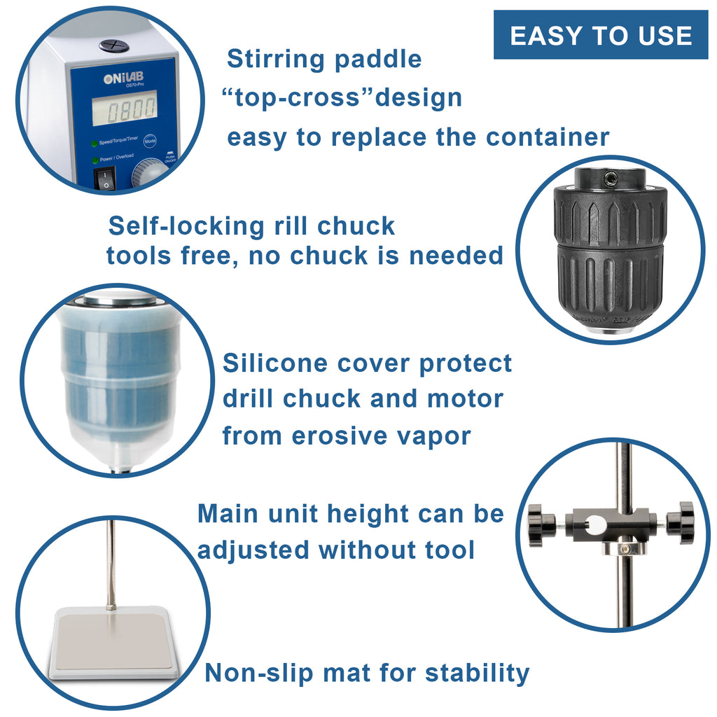 - EASY TO USE –Drill chuck is self-lock design, tools free to hook up and remove the stirring shaft. Stirring paddle"top-cross" design , easy to replace the container with rising the shaft through the unit, do not need to remove the stirring shaft. Silicone cover protecting drill chuck and motor from erosive vapor and splashing